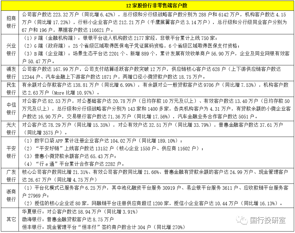 1、零售端客戶數(shù)的積累是各家銀行的重點,多數(shù)股份行的零售客戶數(shù)為千萬級別及以上,其中部分銀行的零售客戶數(shù)超過億戶(如招行、浦發(fā)銀行、中信銀行、光大銀行、平安銀行等等),也有少部分銀行的零售客戶數(shù)為千萬級別左右(如浙商銀行、恒豐銀行與渤海銀行等。
