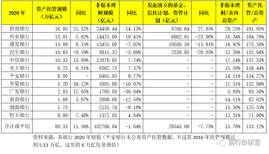 除傳統(tǒng)表內(nèi)業(yè)務(wù)外,以非保本理財和資產(chǎn)托管為代表的表外業(yè)務(wù)亦是股份行的亮點(實際上目前頭部城商行亦在這兩類業(yè)務(wù)上發(fā)力)。截至2020年底,12家股份行的資產(chǎn)托管和非保本理財余額合計分別達(dá)到88.83萬億和10.28萬億,占表內(nèi)總資產(chǎn)的比例平均值分別達(dá)到15.76%和133.12%。