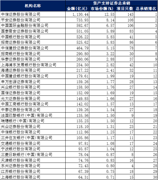 2022年1-7月份,證監會主管ABS承銷排名靠前的機構分別為中信證券、平安證券、國泰君安、中金公司和中信建投,承銷金額分別為851.89億元、719.48億元、349.73億元、349.49億元和268.43億元。前五大、前十大和前二十大承銷商市場份額占比分別為57.09%、74.76%和89.04%。