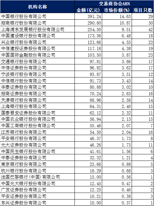 2022年1-7月份,交易商協會ABN承銷排名靠前的機構分別為中國銀行、招商銀行、浦發銀行、建設銀行和興業銀行,承銷金額分別為391.24億元、290.80億元、254.50億元、173.36億元和121.66億元。前五大、前十大和前二十大承銷商市場份額占比分別為46.04%、65.08%和89.43%。