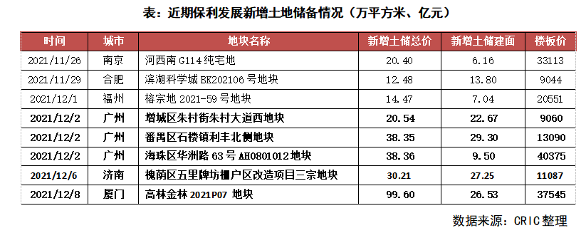 2021年11月融資環境回暖,央企、地方國企成為了先發債對象。其中保利發展11月成功發行兩筆中期票據,合計規模為50億元。而臨近11月末,保利發展先后公告了兩筆融資方案,擬發行98億元公司債,以及100億元規模的租賃住房資產支持證券化產品。僅僅11月,保利發展已發行及注冊擬發行的融資規模就已達到248億。在頻繁融資之后,保利12月在第三輪土拍上頻頻出手,尤其是廣州第三批集中供地投資近百億。