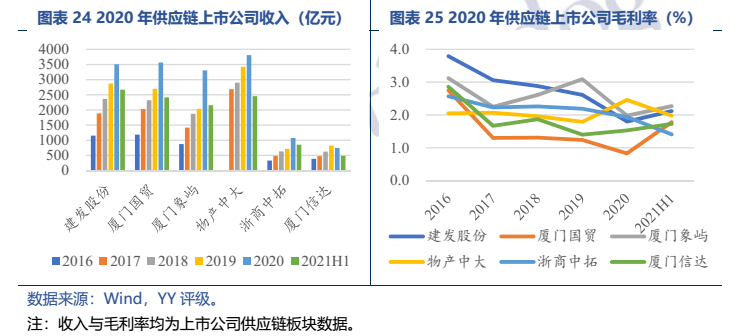 作為一家“供應鏈+地產”雙主業經營的企業,建發股份左手有供應鏈業務提供的穩定現金流,右手有地產開發帶來的高額利潤,兩大業務在盈利與現金流方面實現了一定程度的協同互補。從經營層面來看,供應鏈業務在國內持續領先(2020年排名第三),規模優勢顯著,盈利能力位于行業中上游,周轉能力較低,基本面保持穩定;地產業務近3年才實現突飛猛進的增長。從資金流向來看,建發股份的地產業務負債端資金偏長期,供應鏈業務負債端偏短期,與各自的業務特征匹配度較高。