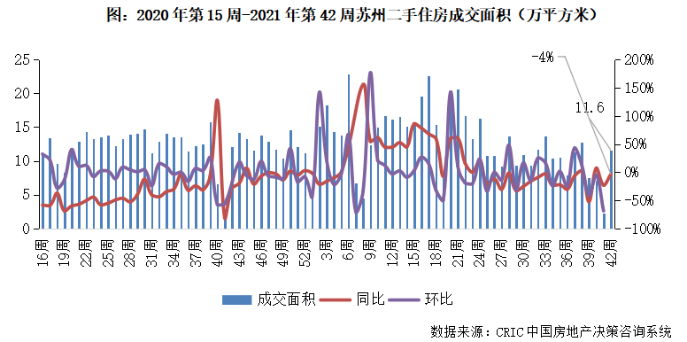 2021年第42周,蘇州二手住房成交面積環比驟升422%,同比跌幅收窄至4%,市場成交規模收11.6萬平方米?;谇?周蘇州市場成交規模大幅回落,本周觸底回升且規?;貧w年內平均水平,預計后續成交規?;蚍€中有升。