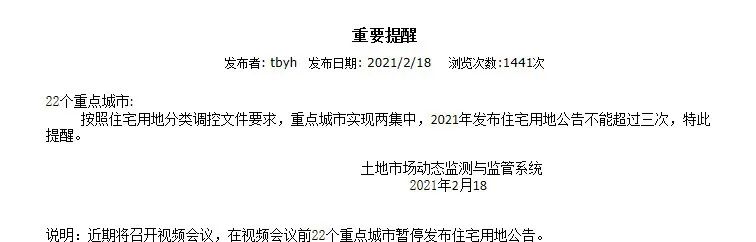 作為配套的監管政策,上述22個城市,將會受到住建部的單獨照顧,會統一安排發布土地出讓公告,統一組織土儲出讓,而且還額外據傳2021年的住宅集中出讓公告,不得超過3次,這個才是重點的重點。如下圖: