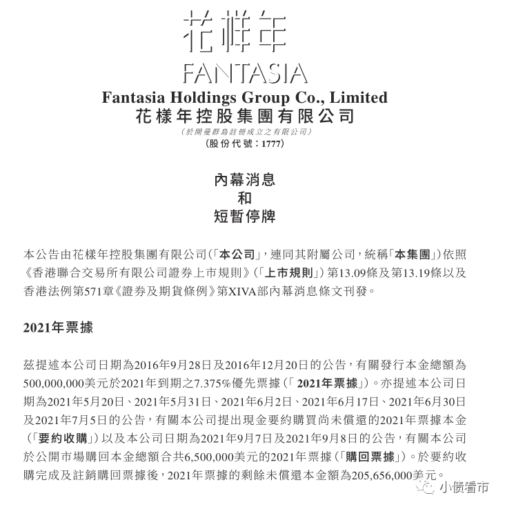 于要約收購完成及注銷購回票據后,花樣年控股上述2021年票據剩余未償還本金額為2.06億美元。根據規管2021年票據的契約,所有未償還本金均于2021年10月4日到期,其未在該日付款。