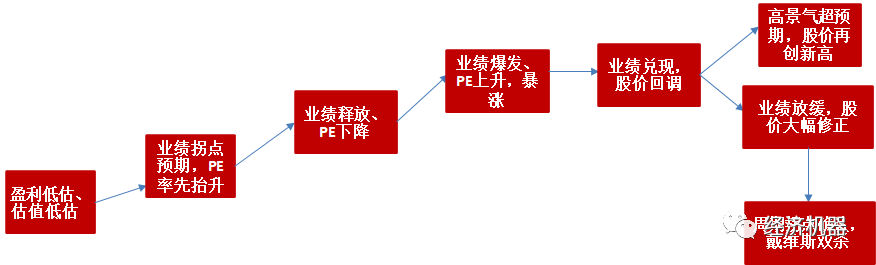 一般來說,周期底部,盈利低點(diǎn),PE/PB估值處于極低水平(對周期股而言,也可能高PE/低PB)。此時,一旦自下而上出現(xiàn)業(yè)績拐點(diǎn)信號,PE/PB估值會率先上升;而后,業(yè)績釋放,PE出現(xiàn)大幅下降。如果業(yè)績進(jìn)一步爆發(fā),盈利增速顯著高于趨勢增長水平。就會出現(xiàn)“戴維斯雙擊”,股價(jià)暴漲。隨后,如果業(yè)績兌現(xiàn),同時明年業(yè)績回到趨勢增長水平,則估值會向合理水平調(diào)整,股價(jià)出現(xiàn)回落。此后,如果高景氣被證明仍可持續(xù),則股價(jià)有望再創(chuàng)新高,估值再次提升;反之,如果業(yè)績隨后出現(xiàn)放緩,股價(jià)有望大幅修正。一旦周期拐點(diǎn)確認(rèn),則會出現(xiàn)猛烈的殺估值現(xiàn)象(圖3),即所謂“戴維斯雙殺”(圖)。當(dāng)然,周期波動并非是圍繞不變中樞的簡單輪回,更可能是波動中樞緩慢抬升。