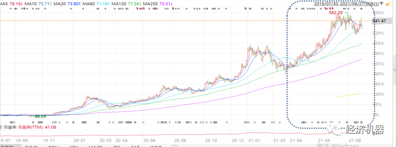 2)部分“核心資產(chǎn)”業(yè)績保持穩(wěn)定,也會因?yàn)楦吖乐岛惋L(fēng)格切換而出現(xiàn)中級別調(diào)整,但上升趨勢未破。比如部分白酒股,中報(bào)業(yè)績符合預(yù)期。但隨著資金從核心資產(chǎn)撤離,再加上高估值內(nèi)在調(diào)整需求,也會出現(xiàn)一波調(diào)整。一般情況下,到了年線就會有較強(qiáng)支撐。但由于本輪中,前期漲幅過大,風(fēng)格切換更加堅(jiān)決,跌破年線成為常態(tài),但一般不會跌破3年線。價(jià)格回調(diào)(比如50%),疊加業(yè)績增長(比如20%-30%),則會迅速消化掉高估值,然后有望再次向上。