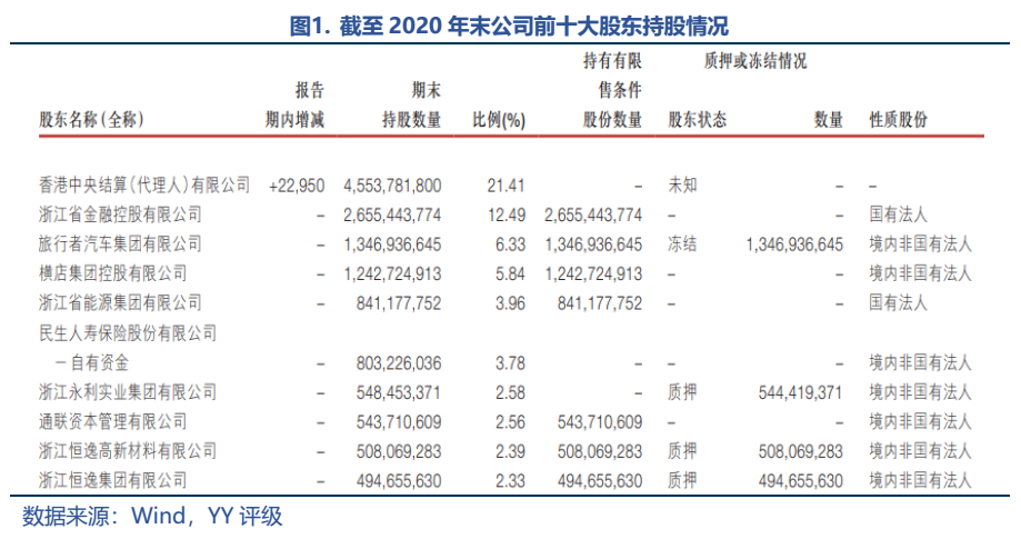 公司的股權(quán)較為分散,無(wú)實(shí)控人,浙江省金控持股12.49%,為第一大股東;其余股東來(lái)自浙江省內(nèi)外的諸多企業(yè),以民企居多。安邦系通過(guò)旅行者汽車、萬(wàn)向控股通過(guò)民生人壽分別持有6.33%、3.78%的股份。
