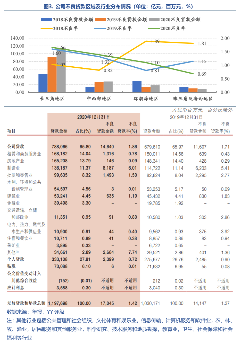 2020年不良率升高主要?dú)w因于租賃、制造業(yè)以及其他行業(yè)。其他行業(yè)不良率的大幅上升(1.36%→7.74%),或與北大方正的20億元借款有關(guān),該借款期限為2018年7月25日至2020年7月24日,年利率7.8%。截止2020年6月,北大方正僅歸還浙商銀行本金2000萬(wàn)元,利息償付至2019年9月20日,2019年四季度的利息未正常支付,考慮到北大方正已破產(chǎn)重組,大概率是壞賬了。租賃、制造業(yè)不良上升,與2020年的疫情沖擊有一定關(guān)系。