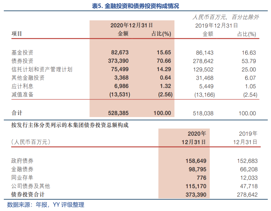 2020年末公司資產(chǎn)中金融投資合計(jì)5283.85億元,占比25.80%,比上年末下降2.97%。金融投資主要配置了大部分的債券以及少部分的基金、信托及資管計(jì)劃,投資的非標(biāo)不斷壓降,債券投資增加,結(jié)構(gòu)有所優(yōu)化;但債券投資中風(fēng)險(xiǎn)相對(duì)較高的公司債券占比30.84%,較2019年有很大增幅,其余以較為安全的政府債、金融債居多??傮w來(lái)看風(fēng)格轉(zhuǎn)向求穩(wěn)。