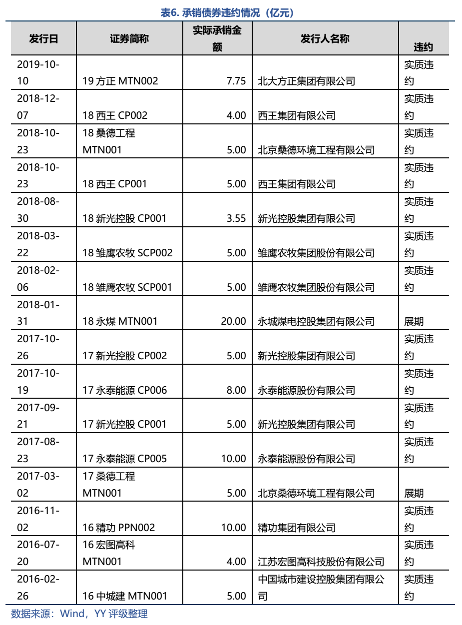 從2016年以來(lái),公司承銷的債券涉及違約/展期共16只,承銷方式均為余額包銷,合計(jì)承銷金額107.30億元。這塊由銀行包銷的債券(具體規(guī)模無(wú)公開披露數(shù)據(jù))的風(fēng)險(xiǎn)處置值得關(guān)注。