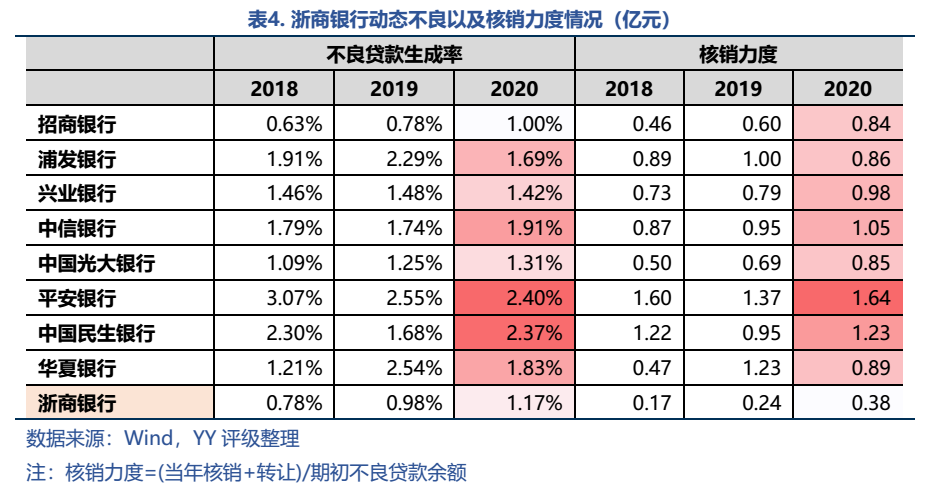 公司整體不良率連續(xù)多年持續(xù)攀升,對(duì)比其他主流股份行,公司的不良貸款核銷力度雖有所加強(qiáng),但仍遠(yuǎn)低于同業(yè)。目前信貸資產(chǎn)的問(wèn)題主要還是集中在存量上,新推進(jìn)的平臺(tái)化戰(zhàn)略形成的資產(chǎn)質(zhì)量較高。