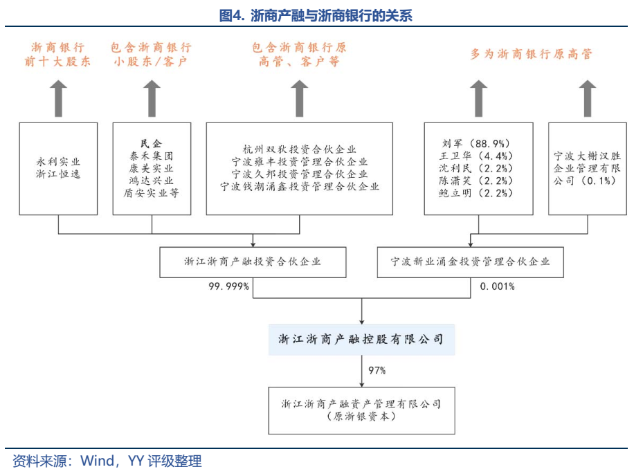 之前浙商銀行有一個(gè)表外運(yùn)作平臺(tái)浙銀資本,后因在寶萬(wàn)之爭(zhēng)中浙商銀行理財(cái)資金通過(guò)浙銀資本輸血130億給寶能,被監(jiān)管要求與浙商銀行隔離;2017年升級(jí)為浙商產(chǎn)融(注冊(cè)資本1000億元,2018年到位250億元)。雖然浙商產(chǎn)融和浙商銀行乍一看并無(wú)股權(quán)關(guān)系,但穿透下來(lái),其股東多為浙商銀行的股東、主要客戶、原高管等。