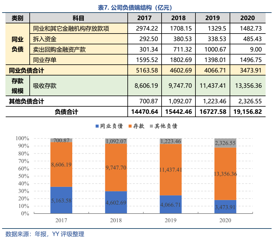 首先公司負(fù)債端的結(jié)構(gòu)中,存款占比已經(jīng)逐年增加至70%左右。存款大多是公司存款,截至2020年末零售存款占比僅19.17%,且其中大部分是個(gè)人定期存款,這也直接導(dǎo)致存款的成本高達(dá)2.64%。