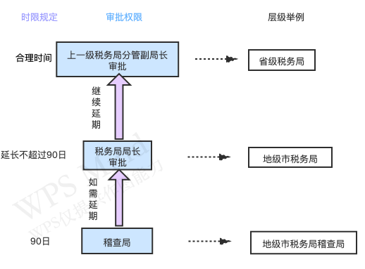 “稽查局應(yīng)當(dāng)自立案之日起90日內(nèi)作出行政處理、處罰決定或者無稅收違法行為結(jié)論。案情復(fù)雜需要延期的,經(jīng)稅務(wù)局局長批準(zhǔn),可以延長不超過90日;特殊情況或者發(fā)生不可抗力需要繼續(xù)延期的,應(yīng)當(dāng)經(jīng)上一級稅務(wù)局分管副局長批準(zhǔn),并確定合理的延長期限?!?/p>