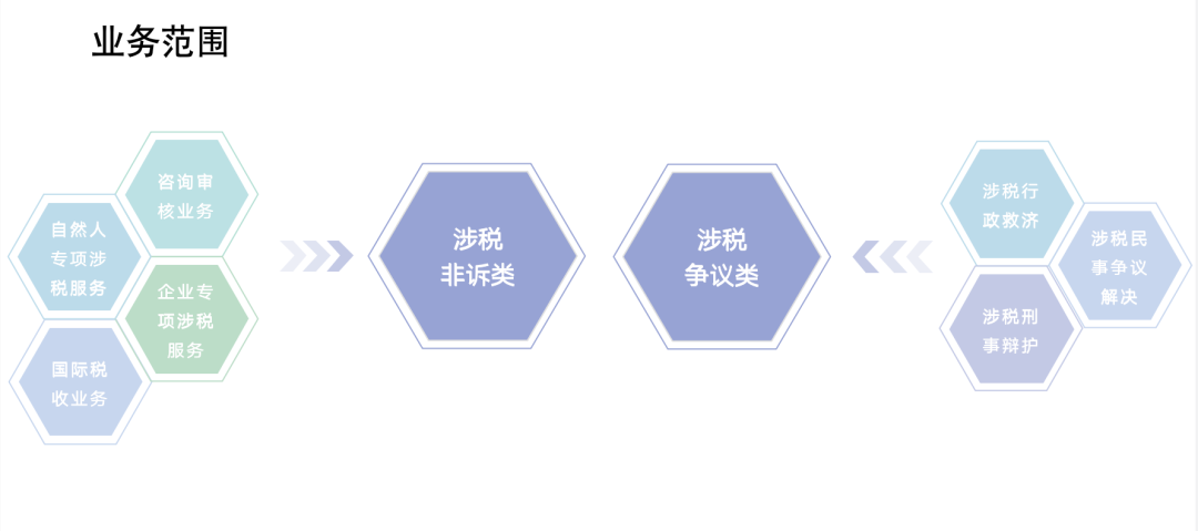 涉稅非訴業(yè)務(wù)主要涉及咨詢審核業(yè)務(wù),企業(yè)專項涉稅服務(wù)、自然人專項涉稅服務(wù)以及國際稅收業(yè)務(wù);涉稅爭議業(yè)務(wù)主要涉及涉稅行政救濟(jì)、刑事辯護(hù)以及民事涉稅爭議解決。