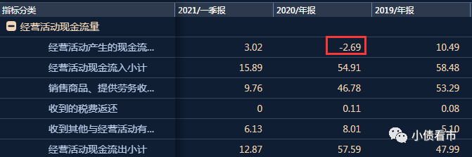 2015-2020年,鵬博士經營性現金流凈額分別為46.58億、41.39億、34.83億、21.83億、10.49億以及-2.69億元,可以看出其現金流水平一路下滑,直至轉為凈流出狀態。
