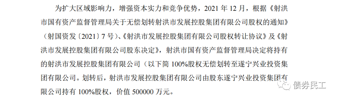 5、根據射洪市國有資產經營管理集團有限公司(主體信用等級AA-)2022年1月28日的公告,射洪市國有資產監督管理局決定將持有的射洪市發展控股集團有限公司100%股權無償劃轉至遂寧興業投資集團有限公司。遂寧興業投資集團有限公司未發行過債券。