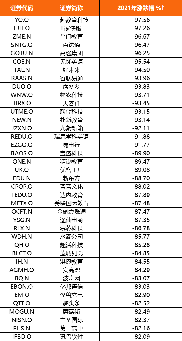 2021年中概股漲跌幅一覽(跌幅前40名)