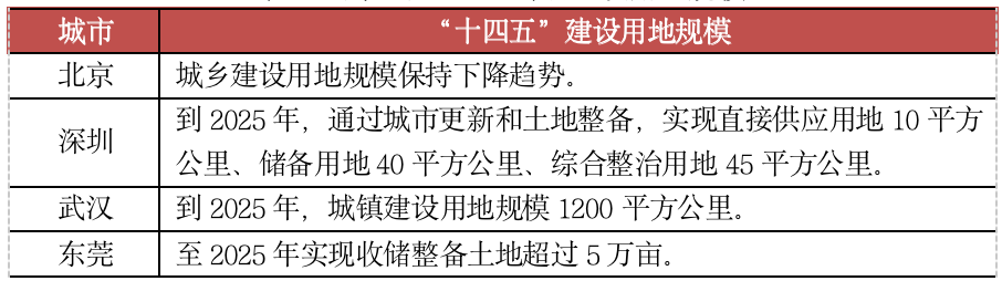 “十四五”時期,多數城市并未明確建設用地規模這一約束性指標,僅限于北京、深圳、武漢和東莞4城有所提及。