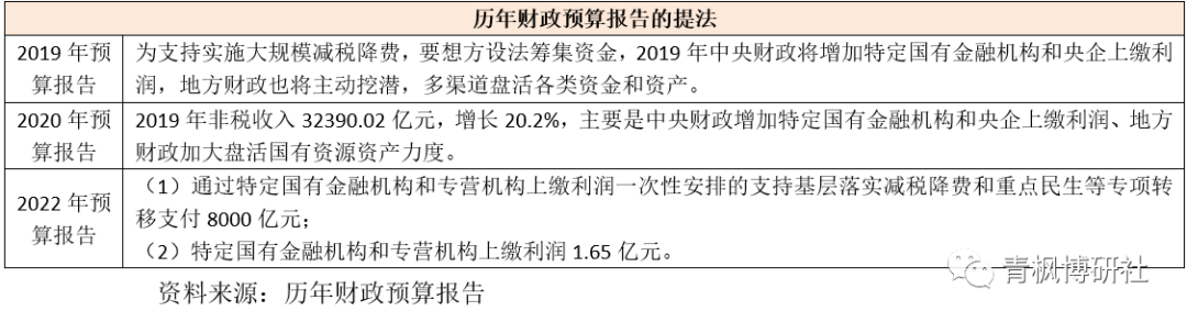 雖然2019年預算報告提出將增加特定國有金融機構和央企上繳利潤,并導致2019年非稅收入同比大幅增加6543億元。但受疫情因素影響,2020-2021年特定國有金融機構和專營機構利潤上繳事宜被暫停。這就意味著2020-2021年兩年期間特定國有金融機構和和專營機構是有結存利潤的,因此2022年預算報告再次提出的該事項,實際上早在2019年便已經做了。