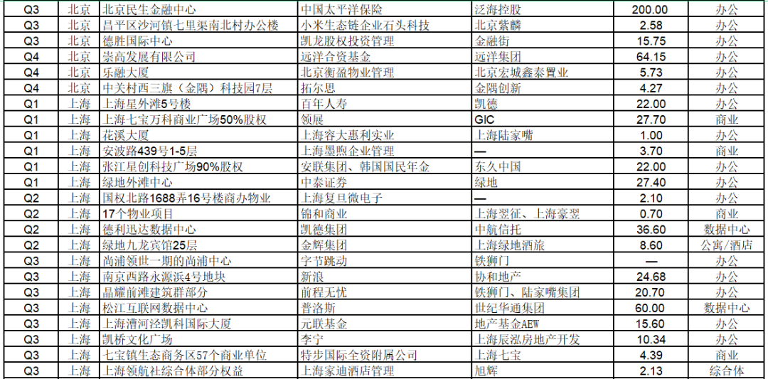 工業(yè)物業(yè)成交錄得大幅提升,占比15%,尤其是錄得多筆物流資產(chǎn)包交易。受益于在線新經(jīng)濟而加速發(fā)展的數(shù)據(jù)中心連續(xù)三個季度錄得成交。