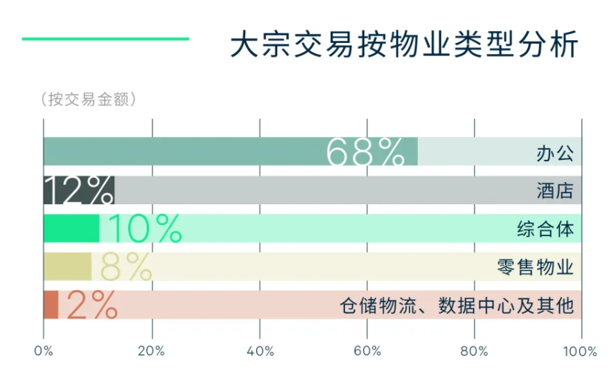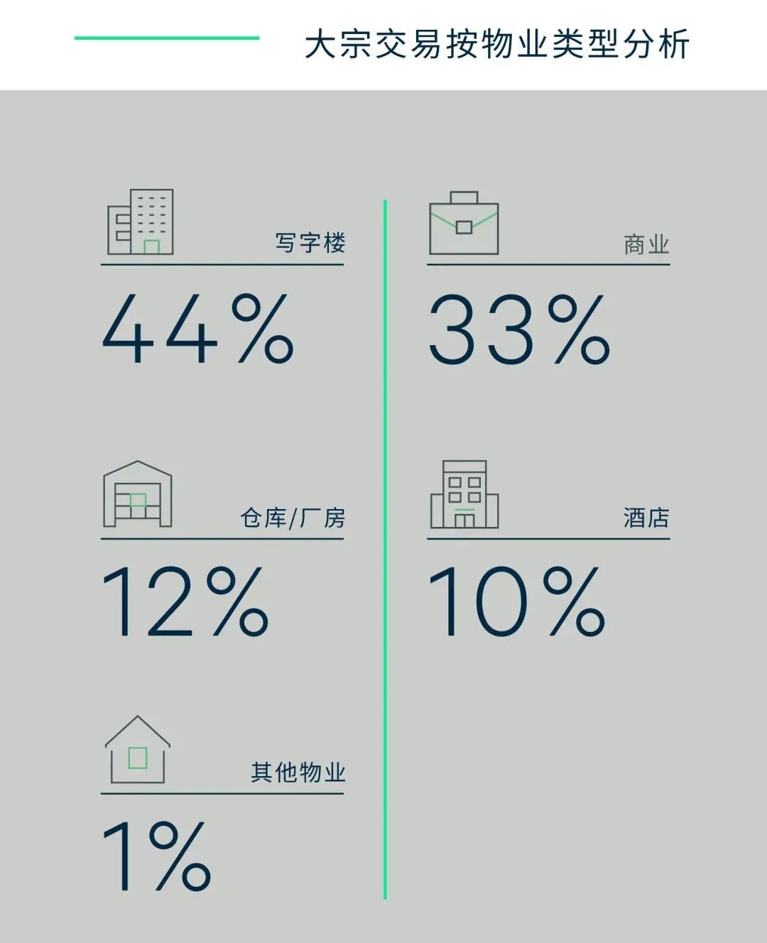 從成交業(yè)類型來看,寫字樓依舊是交易主體,占到總成交量的43%,零售物業(yè)交易上揚,而產(chǎn)業(yè)物流、數(shù)據(jù)中心的交易額在過去一年實現(xiàn)快速增長,成交量同比幾乎翻倍,占總成交額31%。