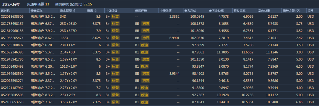 目前,禹洲共有13筆離岸債券,當(dāng)前存續(xù)55.15億美元,今年有1筆余額為2億美元的離岸債到期。