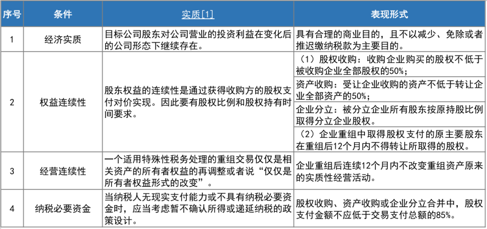 由于企業(yè)重組特殊性稅務處理/稅收優(yōu)惠的目的在于,由于重組產(chǎn)生的效果是使目標公司原股東對目標公司的投資利益以不同形式發(fā)生延續(xù),因此通過納稅時間的遞延,提高企業(yè)重組的經(jīng)濟效率,在盤活資產(chǎn)增值潛能后再收回政府讓渡的稅收利益。以企業(yè)重組中的企業(yè)所得稅為例,若要適用特殊性稅務處理,需同時滿足以下條件: