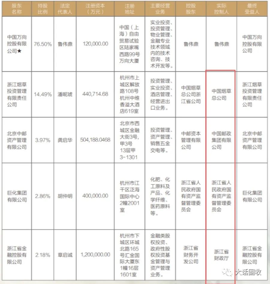 不一樣的不在于大股東,而在于其他幾個(gè)小股東,來頭都“不小”;第二大股東浙江煙草投資,實(shí)控人是中國(guó)煙草總公司;第三大股東中國(guó)中郵,實(shí)控人是中國(guó)郵政集團(tuán);末位倆股東,實(shí)控人分別是浙江省國(guó)資委和浙江省財(cái)政廳。