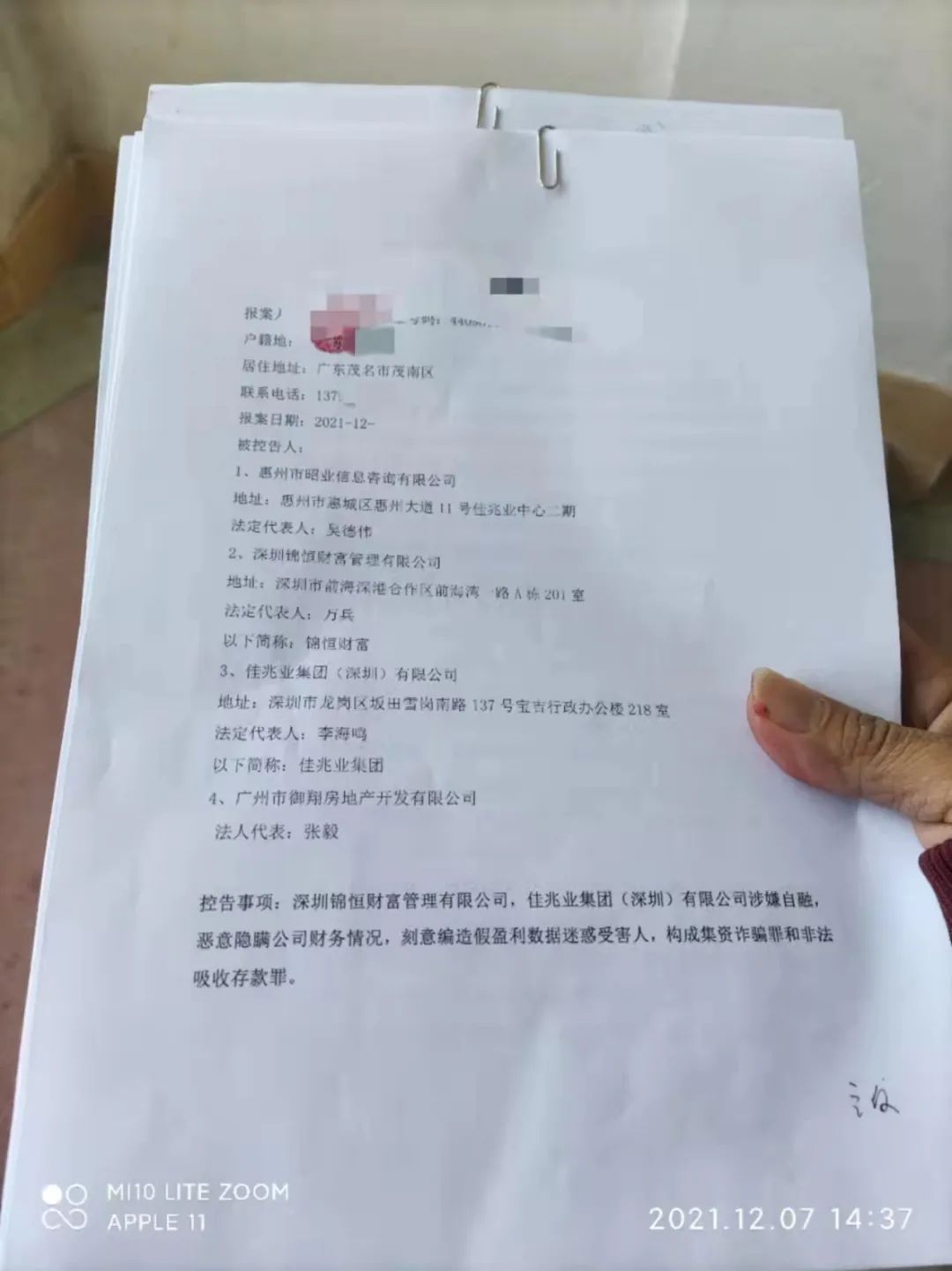 11月4日,500余名投資人心急火燎地趕到佳兆業公司總部討要說法。錦恒財富的年利率在8%-13%之間,“它說是理財產品,其實底層資產都是公司的房產項目。”王先生對鳳凰網《風財訊》坦誠,其實很多人都知道是怎么回事,形勢好的時候,拿回本金都沒有問題,只是誰也沒想到,會是現在這樣的情況。