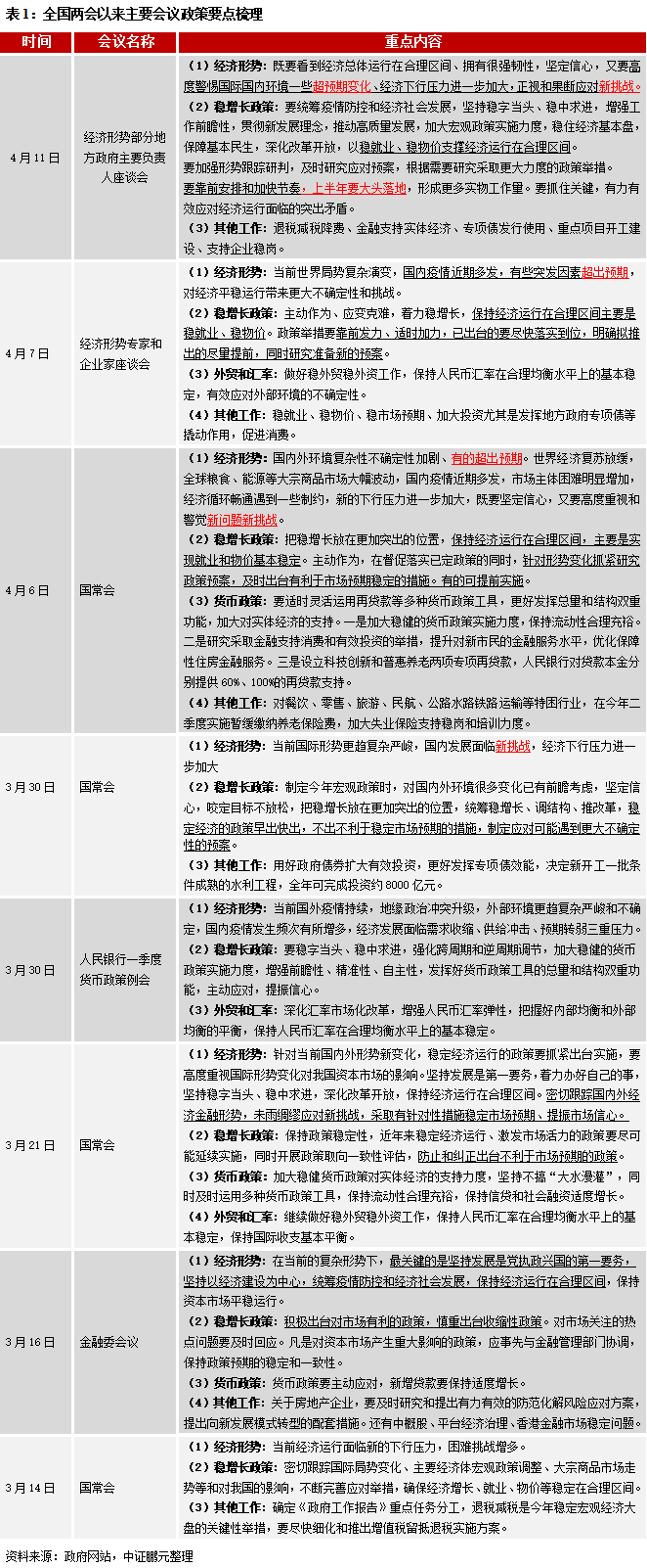 隨著國內(nèi)外形勢出現(xiàn)的超預期變化,穩(wěn)增長政策更加明確和直白。326金融委會議指出積極出臺對市場有利的政策,慎重出臺收縮性政策;3月21日國常會強調防止和糾正出臺不利于市場預期的政策;3月30日國常會要求穩(wěn)定經(jīng)濟的政策早出快出,不出不利于穩(wěn)定市場預期的措施,開始提出要制定應對可能遇到更大不確定性的預案。4月6日國常會和最近兩次座談會對穩(wěn)增長政策表述更是直截了當,有的可提前實施,靠前發(fā)力、適時加力,已出臺的要盡快落實到位,明確擬推出的盡量提前,同時研究準備新的預案,上半年要大頭落地。