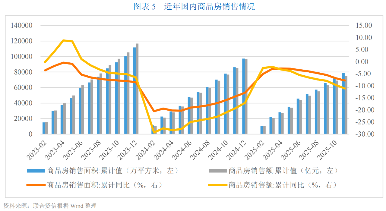 2025年1-11月,全國房屋新開工面積5.35億平方米,同比下降20.50%,降幅自2025年8月以來持續擴大;房屋施工面積65.61億平方米,同比下降9.60%,降幅在下半年有所擴大;房屋竣工面積3.95億平方米,同比下降18.00%,較上年同期收窄8.20個百分點;全國房地產開發投資7.86萬億元,同比下降15.90%,年內降幅持續擴大。
