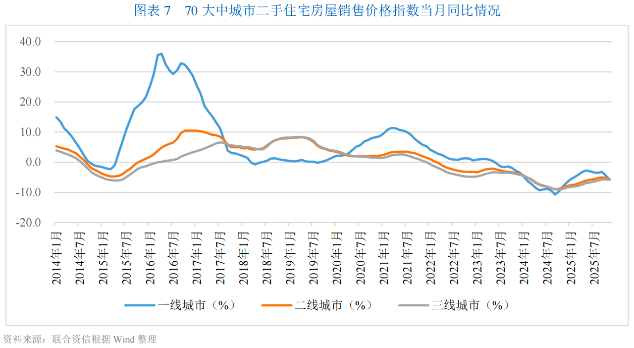 根據70大中城市二手房價格變化來看,一線城市二手房價2023年二季度開始下跌,降幅在2024年10月出現反彈,但在2025年5月重新進入下降區間;二三線城市二手房價于2021年三季度開始下跌,降幅在2023年小陽春微幅反彈后一路下降,并于2024年10月觸底,隨后迎來降幅收窄并趨于穩定。新建商品住宅價格變化方面,2024年以來,一線、二線及三線城市價格指數當月同比情況變動趨勢趨同,均實現“V型”反轉,但進入11月,房價指數同比均有所回落,后續走勢不明朗。