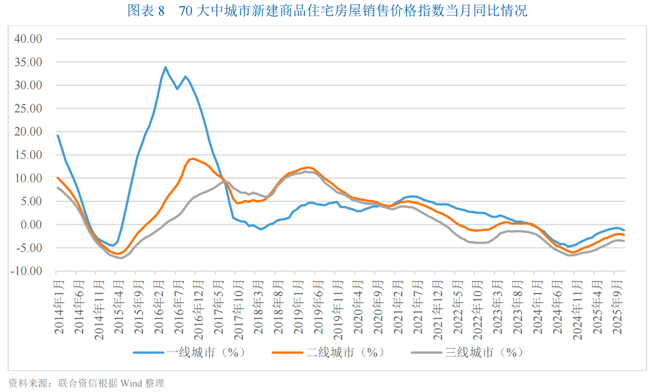 2025年以來,房地產開發經營行業銷售端持續低迷,拖累全國固定資產投資增速轉負,庫存去化周期仍處于高位。房價繼續下降,其中一線城市房價在下半年迎來加速下降。雖外部融資環境維持寬松,但房企融資改善效果有限,在此背景下,房企投資積極性不足,開發投資額繼續收縮。