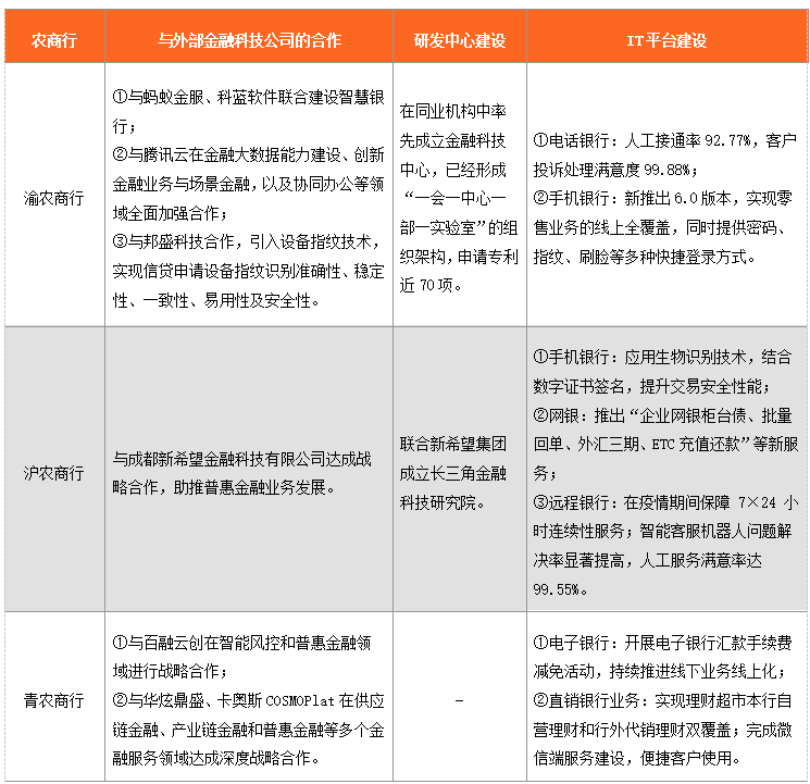 三家銀行還都建立了豐富的IT平臺(tái),包括手機(jī)銀行、電話銀行、網(wǎng)銀、遠(yuǎn)程銀行等。以手機(jī)銀行為代表,渝農(nóng)商行的手機(jī)銀行建設(shè)較為成熟,繼聯(lián)合螞蟻金服和科藍(lán)軟件打造的5.0版本在2019年獲得CFCA“最佳數(shù)字金融創(chuàng)新獎(jiǎng)”之后,又于2020年發(fā)布6.0版本,實(shí)現(xiàn)了零售業(yè)務(wù)的線上全覆蓋;滬農(nóng)商行應(yīng)用了人臉、指紋等生物識(shí)別技術(shù),結(jié)合數(shù)字證書簽名,提升手機(jī)銀行的交易安全性能;青島農(nóng)商行則通過減免電子銀行匯款手續(xù)費(fèi),推進(jìn)線下業(yè)務(wù)線上化。