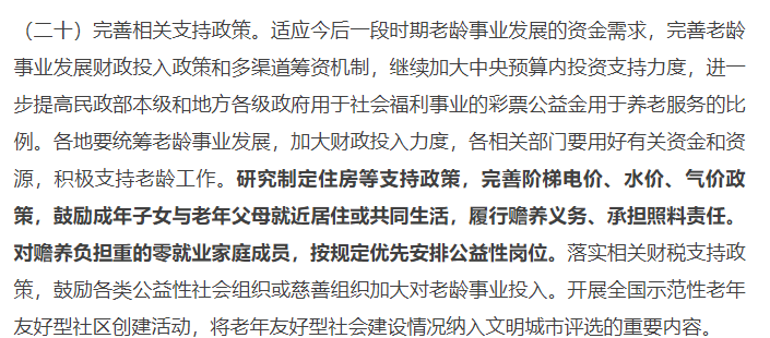 然后11月24日晚,中央《關(guān)于加強(qiáng)新時(shí)代老齡工作的意見(jiàn)》,專門提到鼓勵(lì)成年子女與老年父母就近居住或共同生活,履行贍養(yǎng)義務(wù)、承擔(dān)照料責(zé)任。