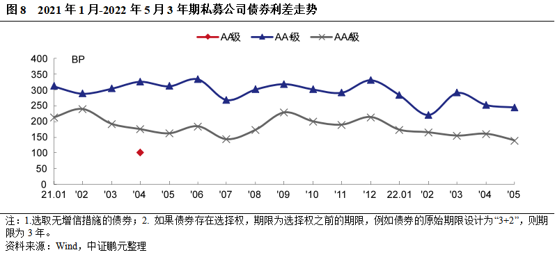 就發行利率而言,2022年5月份交易所公司債券的最高利率為7.80%,較上月最高利率下降10BP;最低發行利率為2.10%,較上月最低利率下降45BP。與4月份相比,公募公司債券方面,AAA級平均發行利率下行17BP、利差收窄13BP,AA+級平均發行利率上行16BP,利差擴大17BP,AA級平均發行利率上行172BP、利差擴大206BP;私募公司債券方面,AAA級平均發行利率下行4BP、利差擴大22BP,AA+級平均發行利率下行38BP,利差收窄35BP,AA級發行利率下行27BP、利差收窄4BP。