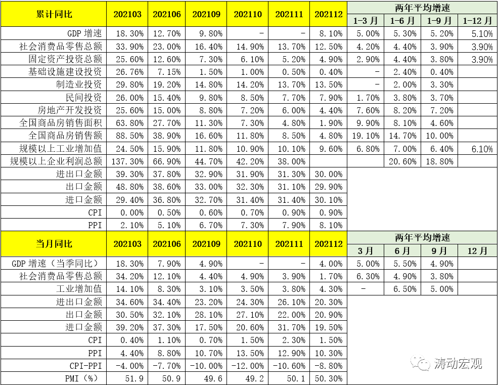 具體看,2021年全年經(jīng)濟(jì)增速達(dá)到8.10%(超過(guò)6%以上的經(jīng)濟(jì)增速目標(biāo)),全年兩年平均經(jīng)濟(jì)增速達(dá)到5.10%,但2021年一至四季度當(dāng)季經(jīng)濟(jì)增速分別為18.30%、7.90%、4.90%與4%,累計(jì)經(jīng)濟(jì)增速則分別為5%、5.30%、5.20%和5.10%,呈現(xiàn)出2021年下半年以來(lái)經(jīng)濟(jì)下行壓力逐漸增大的特征。