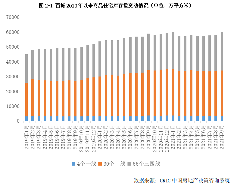 2021年9月,狹義庫存延續穩步上行態勢。據CRIC監測數據,2021年9月百城商品住宅庫存量達到了60169萬平方米,環比上漲4%,同比增長2%。事實上,金九本是傳統營銷旺季,房企推盤積極性穩步回升,9月百城供應環比上漲28%,但因中央信貸收緊,熱點城市調控“高壓”,樓市成交仍延續下行走勢,同環比齊跌,使得狹義庫存延續穩步回升態勢,突破6億平大關。