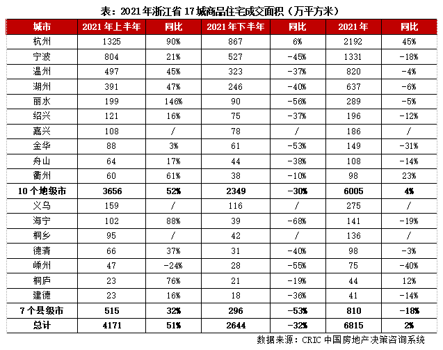 2021年上、下半年,浙江省房地產(chǎn)市場強、弱轉(zhuǎn)折,上半年市場異?;鸨?,下半年則持續(xù)轉(zhuǎn)冷。據(jù)CRIC監(jiān)測數(shù)據(jù)顯示,上半年浙江省10個地級市商品住宅成交3656萬平方米,同比增長52%,7個縣級市成交515萬平方米,同比增長32%。其中,杭州、海寧等成交顯著放量,同比漲幅都在90%附近,麗水更是翻倍增長。下半年10個地級市成交跌至2349萬平方米,同比下降30%;7個縣級市成交降至296萬平方米,同比下降53%。其中,金華、海寧等市場持續(xù)低迷,成交同比腰斬。