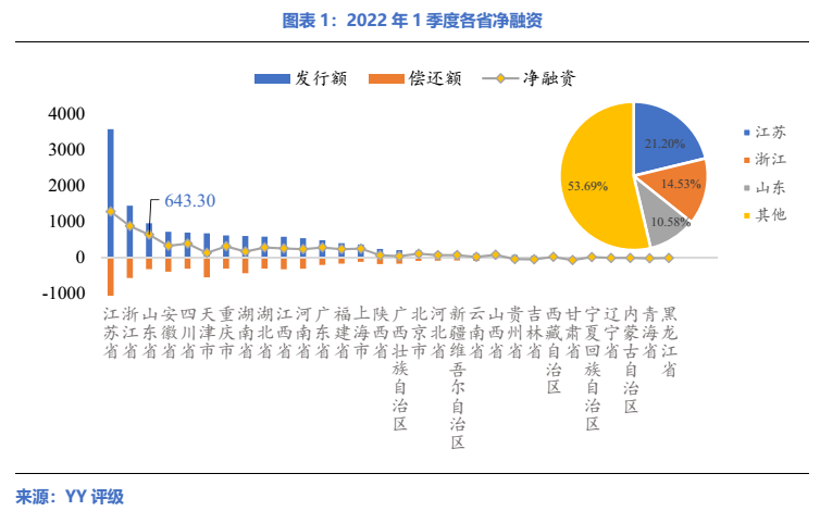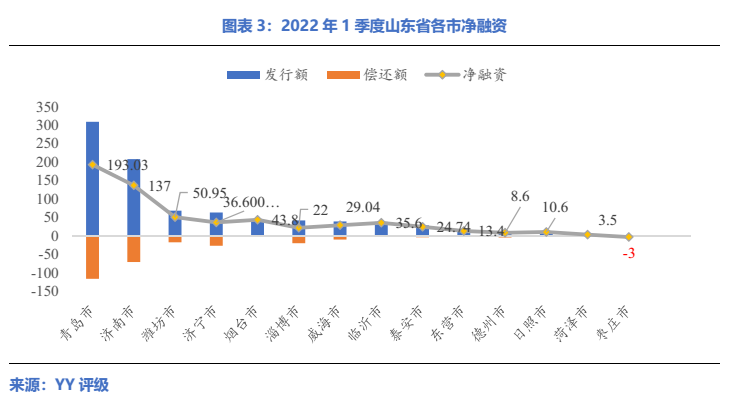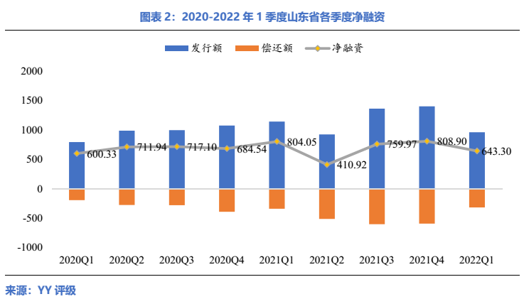 2022年1季度,全國城投債發行額13,728.97億元,償還額元,凈融資7,647.97億元,其中山東省城投債發行額960.85億,償還額317.55億,凈融資643.30億元,占全國凈融資規模的10.58%,位列全國第三。