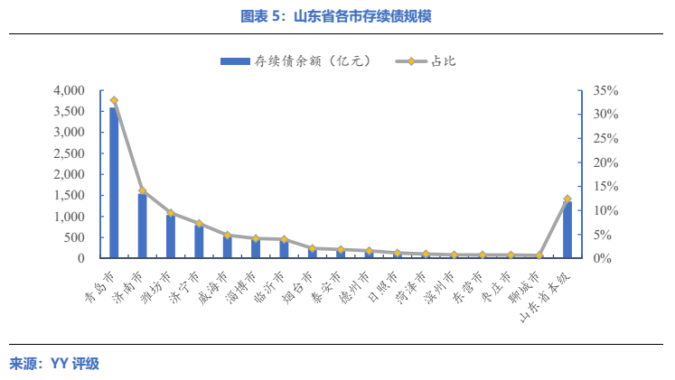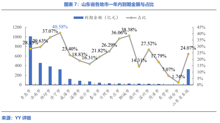 從各地市到期壓力來看,青島、濟南、濰坊和濟寧一年內到期規模較大。青島市一年內到期額超過1,000億元,濟南、濰坊和濟寧則在300-500億元,其余城市皆在150億元以下;從一年內到期規模占存續債規模的比例來看,濟寧有超過40%的存續債將在1年內到期,濰坊、棗莊和聊城的占比亦在35%以上,上述四城短期債券占比偏高。