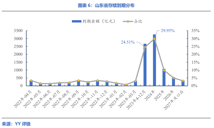 從省級層面來看到期情況,山東省存續債中有2,990.66億將于一年內到期,占比27.45%。未來一年中每月的到期金額相差較小,最低為2023年3月的77億元,最高是2022年11月的365.45億元。