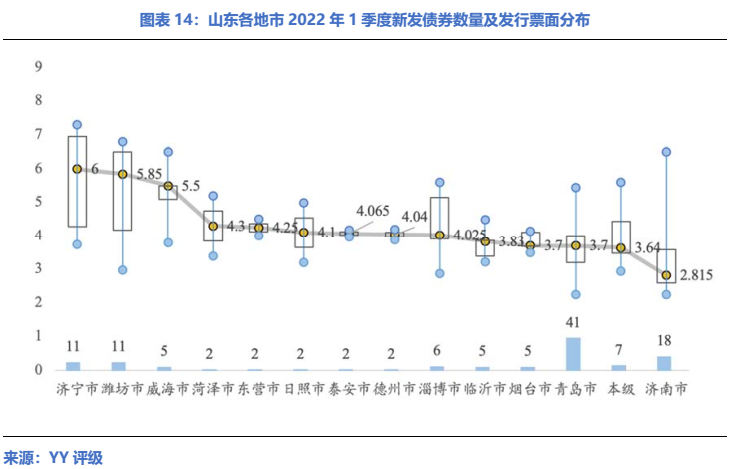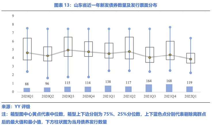 從發行情況來看,山東省近兩年新發債券數量及發行票面利率如下圖所示,2022年1季度發行債券119只,發行額960.85億;全省票面利率中位數小幅下降,2022年1季度發行票面中位數在近兩年來首次低于4%,為3.87%;25%和75%分位數分別為3.40%和4.59%。
