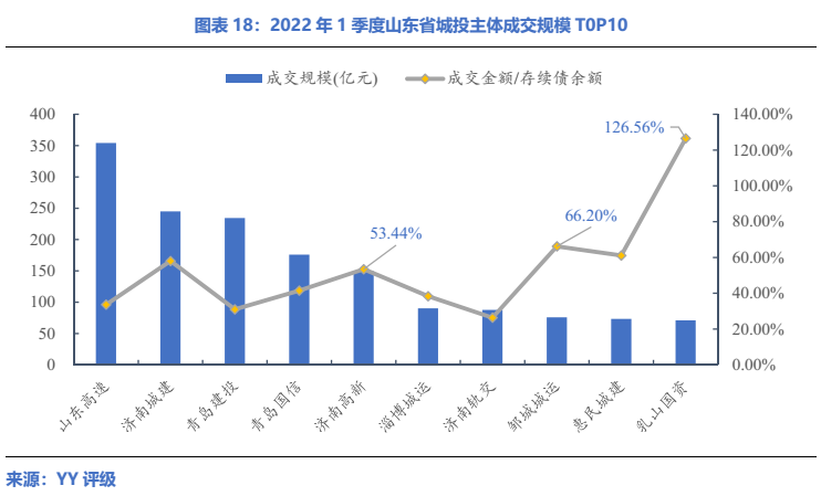 具體到主體層面,2022年1季度成交規模最大的主體是山東高速,成交金額近350億元;從成交金額/存續債余額來看,乳山國資成交最為活躍,成交金額比例超過100%,鄒山城運成交活躍度次之,成交金額占比也高達66.20%。