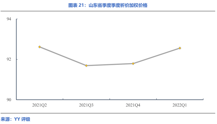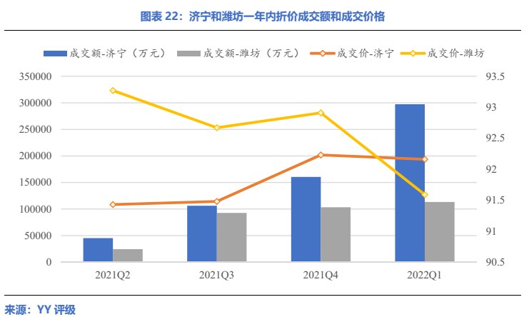 從地級市的成交情況來看,山東省一季度折價成交集中在濟寧市和濰坊市,二者一季度折價成交額合計占全省的97.74%。從濟寧和濰坊近一年的折價成交情況來看,2022年1季度濟寧和濰坊的折價成交金額皆有所上升,在成交價格方面,相比于上一季度濰坊市成交價格有所下降而濟寧市則幾乎持平。