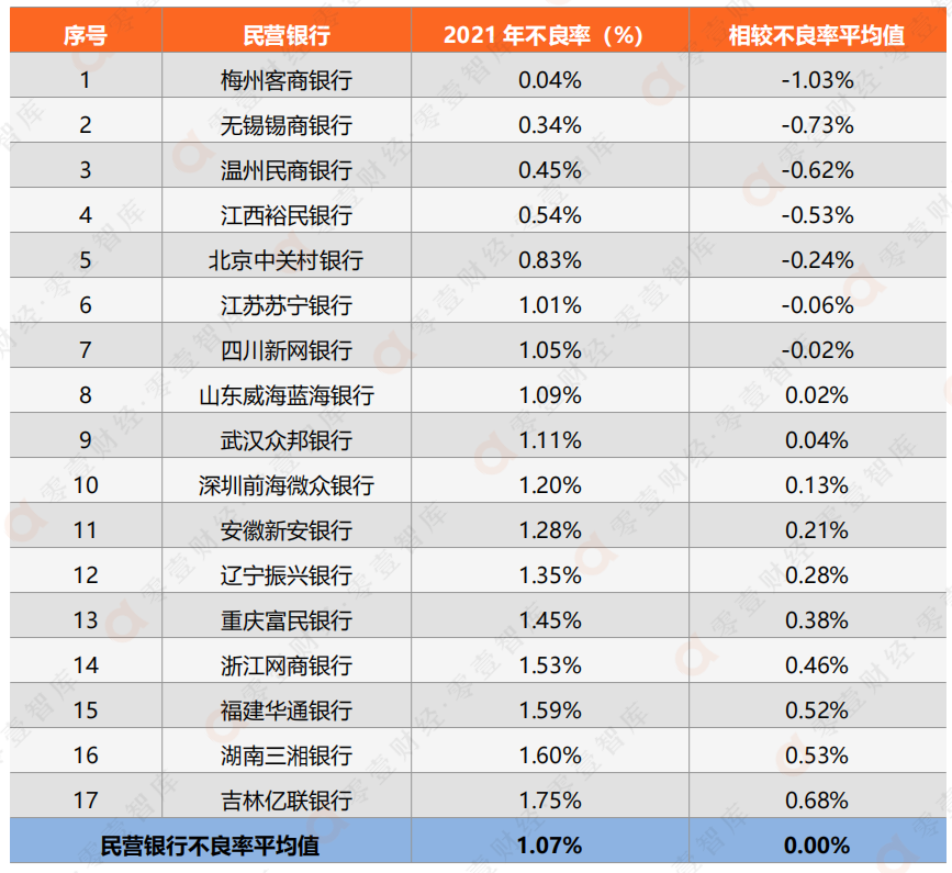 1、上表列出17家民營銀行的不良率數據,此外有2家未披露:一是上海華瑞銀行,尚未發布2021年報;二是天津金城銀行,未披露2021年度不良率數據;