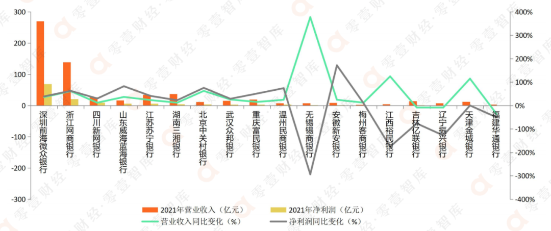 縱觀18家民營銀行已披露的2021年報,零壹智庫選取營業收入與凈利潤兩項指標,從數據指標來看,呈現出明顯的“兩極分化”發展格局。尤其是成立時間較晚的部分民營銀行,業務規模與頭部機構的差距更為明顯。