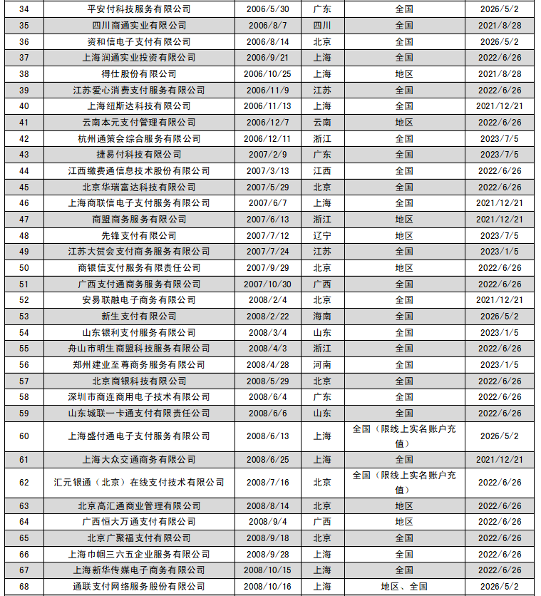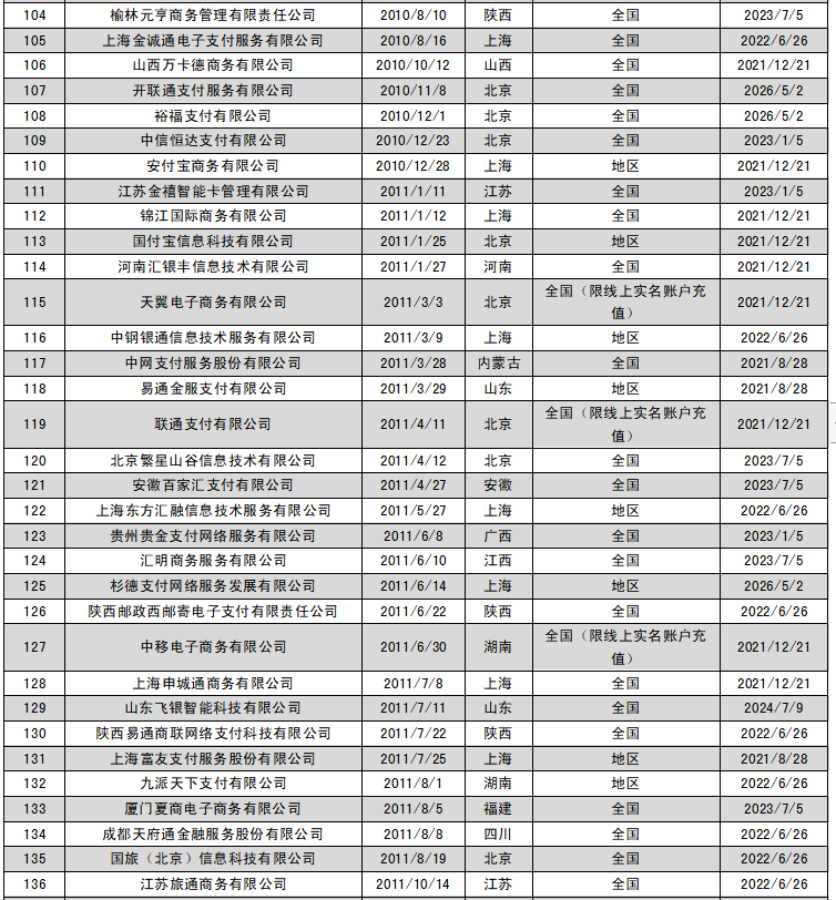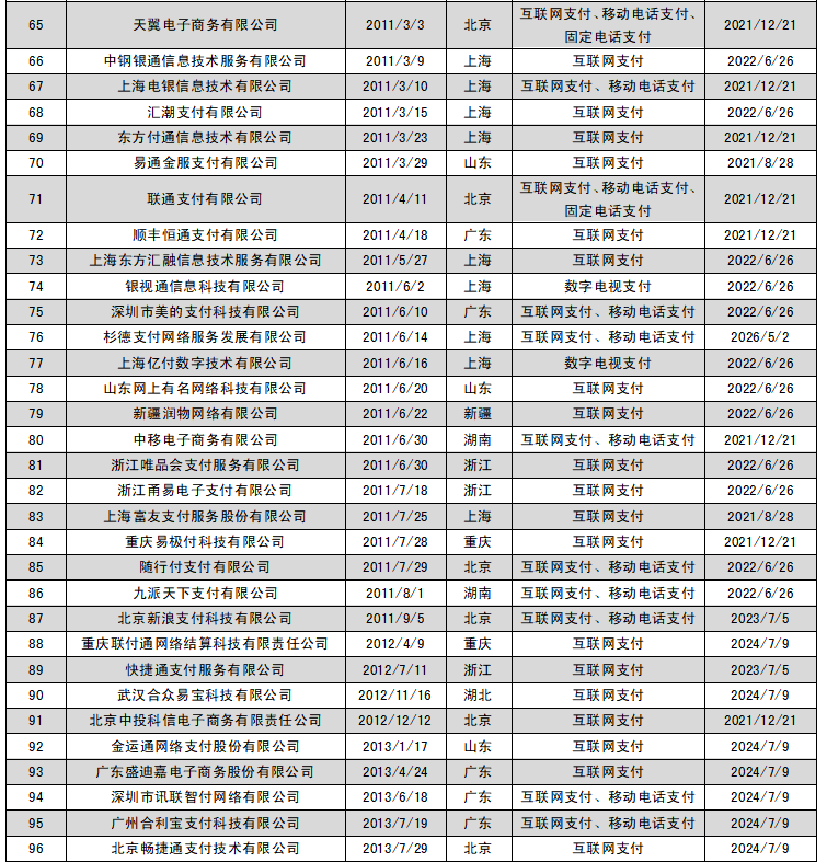 2021年5月13日,央行官網(wǎng)公布首批27張支付牌照續(xù)展結(jié)果,支付寶、財付通、銀聯(lián)商務(wù)、資和信、銀盛支付、通聯(lián)支付等24家支付機構(gòu)全部通過續(xù)展。廣州銀聯(lián)網(wǎng)絡(luò)支付有限公司、北京數(shù)字王府井科技有限公司、北京銀聯(lián)商務(wù)有限公司擬與其控股股東銀聯(lián)商務(wù)股份有限公司開展整合工作,向人民銀行提交了中止續(xù)展審查申請,在中止審查期間繼續(xù)開展業(yè)務(wù)。